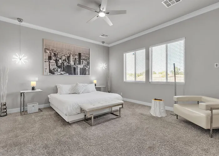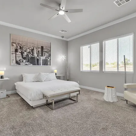 The Barley's Casino & Brewing Co is a 10-minute drive from the 3-bedroom holiday home and Las Palmas Village Shopping Center is a 15-minute ride away. The 3-bathroom villa is nestled 4 km from natural attractions like the 3-acre Ethel M Chocolates Factory and Cactus Botanical Garden. Viva Oasis - A Modern Sanctuary Villa is within a 20-minute drive of a top family-friendly place such as the Wildfire Casino and Lanes.